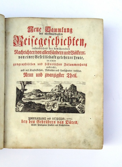 Neue Sammlung der merkwürdigsten Reisegeschichten, insbesonderheit der bewährtesten Nachrichten von allen Ländern und Völkern; von einer Gesellschaft gelehrter Leute, in einen geographischen und historischen Zusammenhang gebracht, und.. Frankfurt und Leipzig, bey den Gebrüdern van Düren, 1771. ...mit Kupferstichen, Medailen und Landcharten versehen. 29. Theil. 2 Bände in 1 Band: 1. Fortsetzung der Geschichte des römischen Reichs nach den Zeiten des Kaysers Augustus, von Tacitus beschrieben, 11. - 16. Buch + Anmerkungen. 2. Fortsetzung der Geschichte des römischen Reichs, unter den Kaysern Galba, Otto und Vitellius, besonders aber zu den merkwürdigen Zeiten des Vespasianus, und dessen grosmüthignen Sohn Titus, von Tacitus geschichtlich beschrieben. 1. - 5. Buch. 4°. Mit 1 gestochenen Frontispiz, 1 gestoch. Titelbild, 7 ganzseitigen sowie 7 gefalteten Kupfertafeln, davon 5 Landkarten. sowie 4 Bl., 296 S., 5 Bl.; 264 S., 6 Falttafeln, 2 Bl., Ganzlederband der Zeit mit marmor. Vorsätzen. - Die Kupfertafeln zeigen Porträtbüsten von Claudius, Nero, Galba, Otho, Vitellius, Vespasianus, Titus sowie 17 griechische und römische Münzen auf 1 Tafel, 1 historische Welt-Karte; 1 Arabien-Karte; 1 Griecheland-Karte, 2 Afrika-Karten sowie eine mehrmals gefaltete "Götterszene". Einband berieben und bestoßen. Rücken angeplatzt und mit größerem Fehlstück. Innen leicht stockfleckig, Karten teilw. randrissig und mit altem Papier hinterlegt.