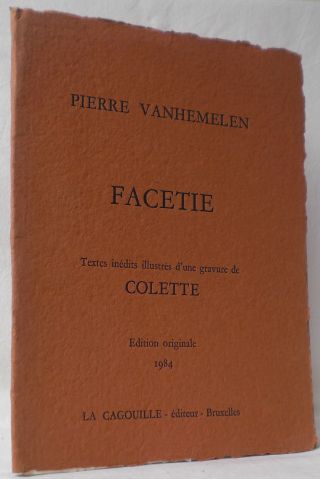 Facetie. Textes inedits illustres d'une gravure de Colette. Brüssel (Bruxelles): Editions sur presses manuelles - La Cagouille. 1984. 18 nn. einseitig bedruckte Bll. und 1 Tafelblatt. Folio. Mit 1 numerierten und signierten Original-Farbradierung von Colette. Mappe gering berieben, bestoßen und verblasst. Einband und Blätter unbeschnitten. Exemplar Nr. 34 der Auflage von 50 Exemplaren. Handpressendruck auf starkem Bütten ("papier d'Arches 250 gr."). Mit längerer handschriftlicher Widmung und Unterschrift (Bleistift) von Pierre Vanhemelen, dat. 3. 04. 85, auf dem 3. Blatt.
