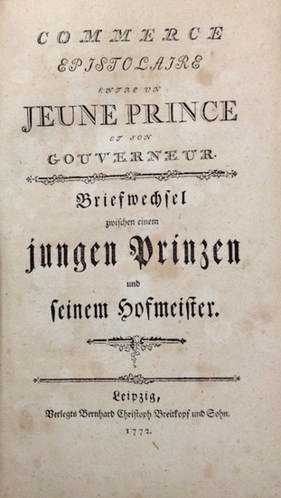Commerce epistolaire entre un jeune Prince et son gouverneur. Briefwechsel zwischen einem jungen Prinzen und seinem Hofmeister. (Aus dem Französischen von Th. H. Gadebusch. Herausgegeben und eingeleitet von G. Giadda). Leipzig, Breitkopf, 1772. 519 S. mit 4 (je 2 wiederholten) gestochenen Vignetten von J. M. Stock. Halbleder d. Zeit mit späterem Rückenschild (beschabt, Ecken etwas bestoßen, Rücken an Kopf u. Fuß mit kl. Einrissen, Gelenke gelockert, Vorsätze erneuert). Erste Ausgabe. Deutsch-französische Parallelausgabe dieses Briefwechsels zwischen dem schwedischen Kronprinzen Gustav (späterer König Gustav III. von Schweden) und seinem Erzieher und Hofmeister Graf von Scheffer aus den Jahren 1759 und 1760, der dem Leser einen Blick "in die ersten Jahre eines Königs" gewährt. Durch seine Veröffentlichung sollten seine Landsleute erkennen, "wie frühzeitig schon die Grundsätze und Gesinnungen, welche sie heute zu Tage bey ihrem Könige bewundern, in seiner Seele gekeimet haben, und wie viel Rechnung sie sich auf die Gründlichkeit einer Tugend machen dürfen, die sich schon in einem so zarten Alter geoffenbaret hat". So ist die Korrespondenz ein Beitrag zur Geschichte Schwedens und zugleich ein wertvolles Dokument zur Pädagogik des 18. Jahrhunderts, ein lebendiger "Fürstenspiegel". Eine Veröffentlichung war von den Beteiligten nie erwogen worden; sie ist unberechtigt geschehen. - Gebräunt u. stockfleckig.