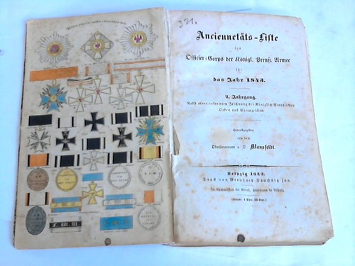 Anciennetäts-Liste des Offecier-Corps der Königl. Preuß. Armee für das Jahr 1843 Leipzig, Tauchnitz, 1843. 272 S./163 S., 1 color. Lithographie mit Ordensabb., orig. Pbd., (teils stockfleckig / Titel stark fleckig / Rücken erneuert)---.