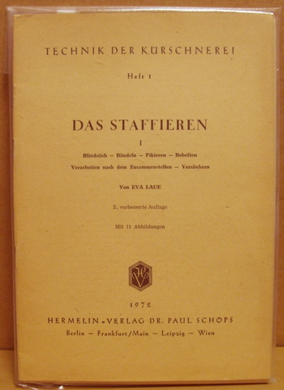 Technik der Kürschnerei. 5 Hefte: Das Staffieren.. Berlin, Frankfurt/ Main, Leipzig, Wien, Hermelin-Verlag Dr. Paul Schöps, 1972. Gr.8°; 20, 20, 18, 20, 20 Seiten, 11, 22, 13, 22, 11 Abbildungen;. Einbände gebräunt; Besitzeinträge. Heft 2: hinterer Einbanddeckel mit kleinem Einriss I: Blindstich-Bändeln-Pikieren-Beheften-Verarbeiten nach dem Zusammenstellen-Versäubern. II: Umbugen-Anschlagen-Anbringen von Verschlüssen-Polsterungen-Von der Anprobe bis zur Auslieferung-Modische Entwicklung des Seidenfutters-Verziehen. IIIStaffierstich-Ziernäthe und Zierstiche-Zuschneiden des Seidenfutters-Auflegen des Schnittmusters auf Futterstoff-Nahtzugaben und Einschlag-Taillierte Futter-Berechnung des Seidenfutterverbrauches, geometrisch-Zusammennähen des Seidenfutters-Bügeln des Seidenfutters. IV:Einstecken des Seidenfutters-Staffieren des Mantels-Einstecken und staffieren von taillierten Mänteln-Futterpaspel-Offenkantiges Verzeihen eines Mantelsaumes-Abschluß. V_ Kleinkonfektion-Nerz-, Marder- und Iltiskolliers-Fuchskollier-Wellenkragen-Stola-Durchsteckkrawatte-Kapuze-Muff-Besätze.