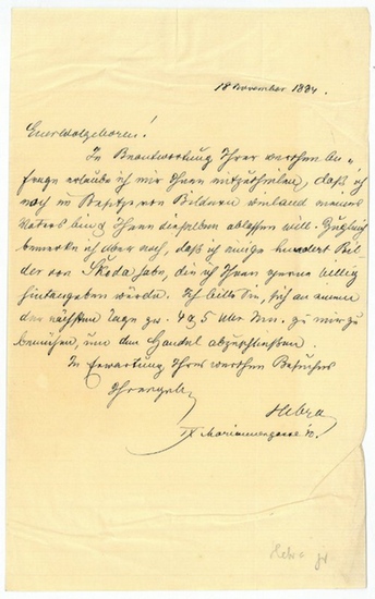 Eigenh. Brief mit U. O. O., 18. XI. 1884. 1 S. 8vo. Mit eh. Umschlag. An Valentin Andreas Heck (1842-1905): "In Beantwortung Ihrer werthen Anfrage erlaube ich mir Ihnen mitzutheilen, dass ich noch im Besitze von Bildern weiland meines Vaters bin & Ihnen dieselben ablassen will. Zugleich bemerke ich aber noch, dass ich einige hundert Bilder von Skoda habe, die ich Ihnen gerne billig hintangeben würde. Ich bitte Sie, sich an einem der nächsten Tage zw. 4 & 5 Uhr zu mir zu bemühen, um den Handel abzuschließen [?]". - Nach dem Medizinstudium an der Univ. Wien (Promotion 1870) wurde Hebra Assistent an der Dermatologischen Klinik seines Vaters Ferdinand von Hebra, deren Leitung er 1880 übernahm, jedoch zugunsten einer Weiterbildung auf Reisen bald aufgab.