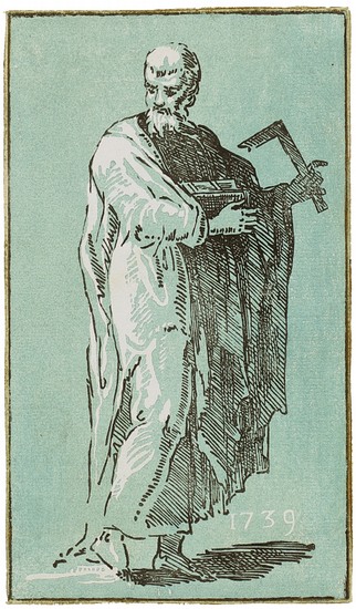 Apostel Jakobus der Jüngere mit Buch und Winkelmaß. _. Chiaroscuroschnitt von zwei Druckstöcken, 1739, auf Bütten. 16,8:9,7 cm. Literatur: Bartsch 48; Le Blanc 48; M. Matile, Della Grafica Veneziana. Das Zeitalter Anton Maria Zanettis. Zürich, Graph. Sammlung ETH, 2016, Nr. 66 mit Abb. Abdruck vor Zanettis Monogramm im Stock. Selten!. Zanetti war Kunstsammler, Radierer und Holzschneider-Dilettant. Er ist bekannt dafür, die Technik des Chiarocuroschnitts, der seit dem 16. Jahrhundert in Vergessenheit geraten war, wieder aufblühen zu lassen. Aus ?Raccolta di varie stampe a Chiaroscuro dai disegni orig. di Francesco Mazzuola, detto il Parmigianino e d?altri insigni autori?. 2 Bde. Venedig 1749, Bd. II, Tafel 9. Sie wurden in einer limitierten Auflage von 30 Exx. gedruckt.