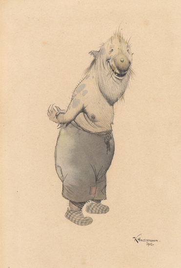Der Gurm 1902. _. Feder in Schwarz und Aquarell, über Bleistift, auf Velin, mit Feder rechts unter der Darstellung signiert und datiert ?K Hassmann. 1902?, rechts unten mit Bleistift betitelt. 25,7:19,3 cm. Gebräunt mit Lichtrandrand rundum. Bekannt wurde Hassmann wegen seiner originellen Tierkarikaturen, wie sie hier vorliegen. Hassmann war Historienmaler und Illustrator. Seine Ausbildung erhielt er an der Wiener Akademie der bildenden Künste bei S. l'Allemand (1840-1910) und an der Münchner Akademie bei O. Seitz (1846-1912) und C. von Marr (1858-1936). 1903/04 war er Mitglied der fortschrittlichen Wiener Künstlervereinigung ?Der Hagenbund?. 1904-1911 lebte er in New York, wo er für das Deutsche Theater Dekorationen und Kostüme entwarf. Nach seiner Rückkehr aus den USA lebte er in seiner Geburtsstadt; im 1. Weltkrieg war er als Kriegsmaler tätig.