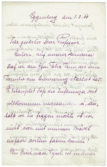 Eigenhändiger Brief mit Unterschrift. Eggenberg, 1. II. 1908. 8vo. 4 1/2 pp. Doppelblatt. An einen Mediziner wegen einer Influenza.