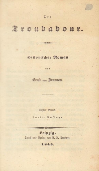 Der Troubadour. Historischer Roman. 2 Bde. in 1 Bd. 2. Aufl. Leipzig, B. G. Teubner, 1843. X, 278; IV, 282 S. Kl.-8vo. Dunkelbraunes Ln. d. Zt. mit Goldprägung. GV 21, S. 118. - Bibl.-Etik. a. Innendeckel. - Die erste Ausgabe erschien 1839 mit dem Untertitel "Romantisches Gemälde aus dem letzten Viertheil des zwölften Jahrhunderts". - Bei diesem Roman haben dem Verf. "die klaren Bilder vorgeschwebt, welche Dietz von dem poetischen Leben in der Provence entworfen hat. In jenes sonnenhelle Land nun u. in die poetische Zeit der Hohenstauffen u. der Kreuzzügeversetzt uns Herr von Brunnow, u. malt uns die Liebe eines Troubadours zu einem edeln Fräulein wirklich mit sehr warmen u. anziehenden Farben aus. Er läßt uns durch alle poetische Elemente jener Zeit hindurchgehn. Hier tritt uns das ritterliche Hofleben, treten uns Turniere, Minnehöfe entgegen; dort erblicken wir die Waldenser in geheimnißvoller Versammlung; ferner begleiten wir den Sänger u. Ritter ins heilige Land u. zu den Sarazenen u. nach mancher Gefahr wieder zurück in die schöne Heimath, wo ihn endlich die Liebe beglückt" (LB 15, April 1839, Nr. 38, S. 151 f.). - Ernst von Brunnow (1796-1845).