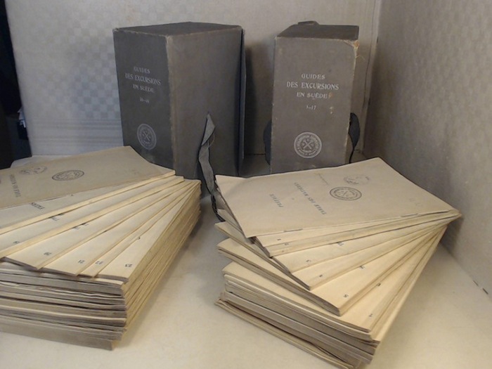 Guides des Excursions Geologiques en Suede 1-40. 40 Broschüren in 2 Original-Sammelordnern, (40 in two Volumes), Geologorum Conventus Suecia, Stockholm 1910. durchschittlich 20 bis 50 Seiten je Abhandlung Seiten mit zahlreichen Abbildungen, Karten und Tafeln, 8°, Original-Broschur in Leinwand.Mappen, Bibliotheks-Exemplare (ordnungsgemäß entwidmet), Stempel auf der Mappe und auf den Abhandlungen, Ecken der Broschüren teils leicht eselsohrig, die Sammelmappen leicht beschädigt, insgesamt ordentliche und innen saubere Exemplare,. Vollständige Sammlung von 40 Abhandlungen, die auf dem Stockholmer Geologischen Kongress vorgelegt wurden. Diese sind in Englisch und Deutsch, einige in Französisch. (Complete collection of 40 papers submitted at the Stockholm Geological Congress. These are in English and German, some in French).