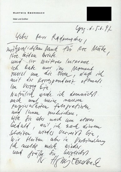 Eigenhändiger Brief mit Unterschrift. (Hartwig Ebersbach, geb. 17.05.1940 in Zwickau, deutscher Maler). _. 17-zeiliger, handschriftlicher Brief von Hartwig Ebersbach mit schwarzem Kugelschreiber auf Briefpapier, mit eigenhändiger Unterschrift, an den Grafiker Manfred Rademacher, datiert Lpzg. 5.6.[19]97. Blatt mit 2 horizontalen Knickspuren (zum Versand im Briefumschlag). Beiliegender Briefumschlaf von Hartwig Ebersbach handschriftlich adressiert. Sehr gutes Exemplar.