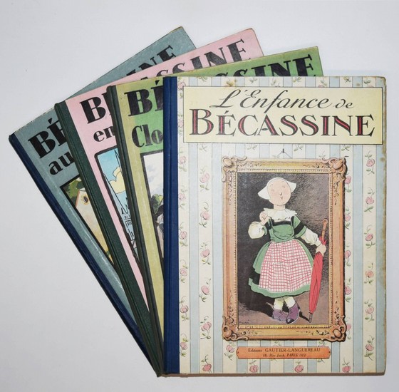 L'enfance de Bécassine. (Et) Bécassine en Apprentissage. - (Et) Bécassine au Pensionnat. - (Et) Bécassine à Clocher-les-Bécasses. Illustrations de J(oseph) P(orphyre) Pinchon. Paris, Editions Gautier-Languereau, 1930-1935. 4°. 61 S.; 63, (1) S.; 61, (1) S.; 63, (1) S. mit zahlr. farb. Illustrationen. Farbig illustr. OHln. 4 Bände. (Les aventures de Bécassine, vol. I, II, XV et XXIV). LKJ I, 410. - Band XXIV in erster Ausgabe. - Die zuerst 1905 in der Kinderzeitschrift "La Semaine de Suzette" erschienenen Abenteuer des etwas einfältigen bretonischen Bauernmädchens in Paris waren der "Beginn der berühmten Serie von "Bécassine". Von der Zeichentechnik her gesehen, steht Pinchon noch auf der Grenze zwischen Bildgeschichte und Comic. Er stellt seine Bilder selten in einen Rahmen, benutzte aber eine Art Blendentechnik, um seine Leser auf eine bestimmte Stelle aufmerksam zu machen, indem er diese Szenen mit einem Kreis kennzeichnete. In all seinen Zeichnungen kann man die familiäre wie soziale Atmosphäre seiner Epoche entdecken. Seine Bände bieten eine Chronik des französischen Lebens nach der Jahrhundertwende..." (H. Müller in LKJ). - Kanten berieben und etwas bestoßen, zeitgenöss. Besitzvermerke, nur vereinzelt gering braunfleckig und etwas gebräunt, gute Exemplare.