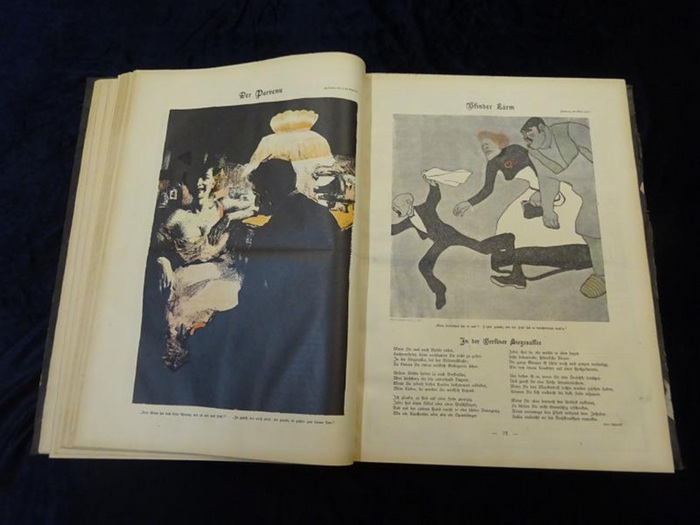 Simplicissimus. Illustrierte Wochenschrift. 6. Jahrgang. 51 von 53 Ausgaben, es fehlen Nr. 22 u. 27. München, Langen [1901]. Gr.-4°. Je Heft 8-10 Seiten, mit zahlreichen, überwiegend farb. Abb., priv. HLnbd. d. Zeit, Kanten berieben u. mit Fehlstellen, Seiten vereinzelt an d. Ränder mit Klebeband verstärkt. Der Simplicissimus ist die bis heute prominenteste deutsche politisch-satirische Wochenschrift. Ihr Name steht für die antiklerikale, antifeudale und fundamentaldemokratische Auseinandersetzung mit der Innen- und Außenpolitik des Kaiserreichs und der Weimarer Republik ebenso wie für pointierte Mentalitätskritik am deutschen Normalbürger, den er als ?Michel? mit Zipfelmütze porträtiert. Für literarische, historische und soziologische Fragestellungen im Kontext der beiden Weltkriege bietet die Zeitschrift ein unersetzliches Quellenmaterial. International hat sie als zeitgeschichtliches Zeugnis Gewicht wie kaum ein anderes deutsches Periodikum.