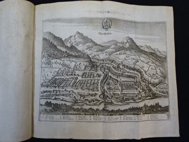 Topographia provinciarum Austriacarum Austriae Styriae, Carinthiae, Carniolae, Tyrolis etc : Das ist Beschreibung und Abbildung der fürnembsten Stätt und Plätz in den osterreichischen Landen Under und OberOsterreich, Steyer, Kärndten, Crain Und Tyrol. Frankfurt am Main, Merian (1736), 2. Beibindung in zweiter Auflage von 1656. Gr.-4° (21 x 24cm). Gest. illustr. Tit., 2 Bll. (Dedicatio), 92 S., 5 Bll. (Reg.), 52 S., 4 Bll. (Reg.), 14 S., 1 Bll. (Register). Mit 165 Darstellungen (Ansichten und Landkarten) auf 118 teilweise gefalteten Kupfertafeln. Fachgerecht restaurierter Lederband der Zeit auf 6 Bünden mit 2 Rückenschildchen u. Rückenvergoldung sowie Voll-Rotschnitt, mit 2 Exlibris auf vord. Spiegel. Lederbezug etw. brüchig, Goldauflage großteils abgelöst, einige Bll. m. kl. restaur. Einrissen im oberen Rand. Einige Tafeln eng beschnitten. "Nebehay-Wagner 407. Vorliegend der 10. Band der 'Topographia Germaniae', Hauptwerk des schweizer Kupferstechers und Verlegers Matthäus Merian d. Ä. (1593-1650). Dieser begann 1642 mit der Herausgabe des groß angelegten Gesamtwerks, das bis heute als eines der bedeutendsten Werke der geographischen Illustration gilt. Das Gesamtwerk umfasste schließlich 30 Bände (sowie einen Registerband) mit zusammen über 2000 detaillierten Einzelansichten von bemerkenswerten Städten, Klöstern sowie Burgen und war damit eines der größten Verlagswerke seiner Zeit. M. Merian war ein Meister der Perspektive, seine nach der Natur aufgenommenen Ansichten stellen oftmals die ältesten zuverlässig dokumentierten Ansichten der jeweiligen Orte dar. - Hier die 6. Ausgabe, seitengleich mit der 3. Ausgabe (1677-1679). Ohne die Ansicht von Meran, die nach der 4. Ausgabe zumeist nicht mehr beigegeben ist. Insgesamt gutes Exemplar mit behutsam restauriertem Einband des berühmten topographischen Werkes mit Ansichten, denen 'einzigartiger dokumentarischer Wert zukommt' (ÖBL II,48) : sie zeigen Krems, Eisenstadt, Gmunden, Bad Ischl, Linz, Melk, Klosterneuburg, Wien, Wels, Kremsmünster, Graz, Klagenfurt, Villach, Innsbruck, Kufstein u. a. - Mit eingebunden die beiden Anhänge: BESCHREIBUNG DER FÜRNEHMSTEN ORT, in Oesterreich, Steyer, Kärndten, Crain,Tyrol und einverleibten Landschafften / Darin nicht allein der vorige Text unterschiedlich corrigirt; Sondern, was man ferners darzu gefunden, und berichtet worden / auch angezeiget wird. [Und:] ABSONDERLICHE BESCHREIBUNG Der Herrschafften, Städte und Schlösser, Windhaag, Feichenau, Horn, Drosendorff und Petronell, sampt derselben Angehörungen. - Differenzbesteuert.".