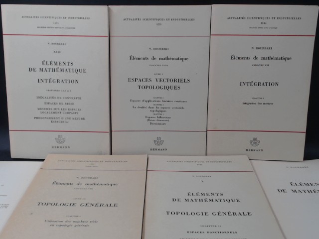 Intégration Ch. 1-4/ Espaces Vectoriels Topologiques/ Intégration Ch. 5. 3 Bücher zusammen und 2 Zugaben. Deuxiéme Edition Revue et Augmentée (Buch 1). Deuxiéme Edition Revue et corrigée (Buch 3). Paris; Hermann, 1965, 1967, 1967. 283, 191, 154 S. Gr.-8°(=22,5-25cm), Broschiert. Intégration Ch. 1-4/Espaces Vectoriels Topologiques/Intégration Ch. 5. 3 Bücher zusammen und 2 Zugaben: 1) Intégration. Chapitres 1, 2, 3 et 4. Livre VI: Inégalités de Convexité. Espaces de Riesz u.a. Élements de mathématique Fascicule XIII [Actualités Scientifiques et Industrielles 1175]; 2) Escapes Vectoriels Topologiques Livre V. Chapitre 3: Escapes d'applications linéaires continues. Chapitre 4: La dualité dans les espaces vectoriels topologiques. Chapitre 5: Escapes hilbertiens (Théorie elémentaire). Dictionnaire. Élements de mathématique Fascicule XVIII [Actualités Scientifiques et Industrielles 1229; 3) Intégration Chapitre 5: Livre V. Intégration des mesures. Élements de mathématique Fascicule XXI [Actualités Scientifiques et Industrielles 1244]. Besitzvermerke. Einbände mit geringen Gebrauchspuren. Buchrücken hat sich vom Buchblock abgelöst, Bindung aber noch intakt (Buch 3). Sonst guter Gesamtzustand. Als Zugaben: 1) Nicolas Bourbaki/ Topologie Générale Chapitre 9. Livre III: Utilisation des nombres réels en topologie générale. Elements de mathématique Fascicule VIII [Actualités Scientifiques et Industrielles 1045]; 2) Nicolas Bourbaki/ Topologie Générale Chapitre 10. Livre III: Espaces Fonctionnels. Elements de mathématique Fascicule X [Actualités Scientifiques et Industrielles 1084]. Buchrücken hat sich vom Buchblock gelöst, Bindung ist aber noch intakt. Mit drei Info-Blättern als Beilage.