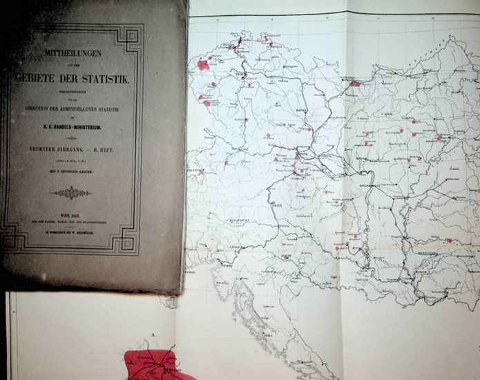 Steinwaaren, Thonwaaren, Glaswaaren. (=Industrie-Statistik der ?sterreichischen Monarchie f?r das Jahr 1856 1. Heft = Mittheilungen aus d. Gebiete der Statistik. 6. Jahrgang 2. Heft) Wien, Staatsdruckerei Braum?ller in Komm, 1857. original Broschur, gr.-8?, X,136Seiten; mit 2 gefalt. Landkarten gut.