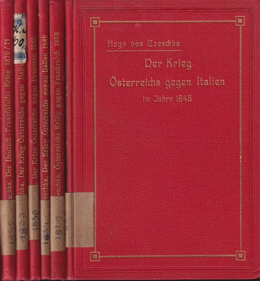 Behelf zum Studium der Kriegsgeschichte zusammengestellt aus authentischen Quellen. Wien, Seidel & Sohn (1912). Bde. 1-6 (v. 10) ap. 8°. insges. ca. 400 S. Mit 23 gefalt. Skizzen in Laschen. OLn. Kopfgoldschn. Bibliotheksetiketten auf den Buchrücken. Fliegende Vors u. Tit. m. Stempel diverser Militärinstitute, Vorderdeckel v. Bd. 2 u. 6 fleckig. EA. Selten! - Heft 1: Der Krieg Österreichs gegen Italien im Jahre 1848. Heft 2: Der Krieg Österreichs gegen Italien im Jahre 1849. 3. Heft: Österreichs Krieg gegen Frankreich und Piemont im Jahre 1859. 4. Heft: Der Krieg gegen Preußen im Jahre 1866. 5. Heft: Der Krieg Österreichs gegen Italien im Jahre 1848. Heft 6: Der Deutsch-Französische Krieg im Jahre 1870/71.