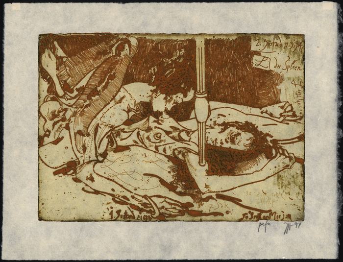 LI der Spleen. Milly. 2. Zustand. 12.3.94. [Signierte Original-Farbradierung / signed original color etching]. _. (Horst Janssen, geboren am 14. November 1929 in Wandsbek bei Hamburg, gestorben am 31. August 1995 in Hamburg. Zeichner, Grafiker, Autor, Plakatkünstler, Illustrator und Fotograf, einer der herausragendsten und produktivsten Zeichner und Grafiker des 20. Jahrhunderts). Original-Farbradierung in Orange auf leicht gelblichem Japanpapier. Unterhalb der Abbildung von Horst Janssen in Blei signiert, datiert (94) und mit "pefe" bezeichnet. Im Druck beschriftet und datiert. Maße Blatt: 27,8 x 36,0 cm. Maße Abbildung: 20,3 x 28,5 cm. Rückseitig schwache Spuren ehemaliger Montage im Rahmen. Sehr gutes Exemplar.